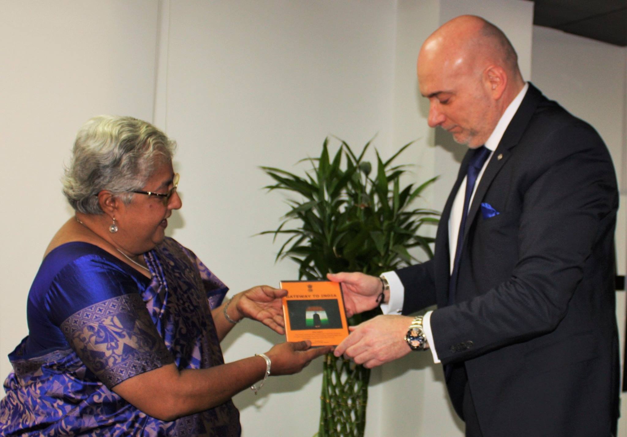 Dr. Alain Hakim, Minister of Economy & Trade, Republic of Lebanon, accepting a copy of "Gateway to India", a set of 3 CDs providing information on how to do business in India.