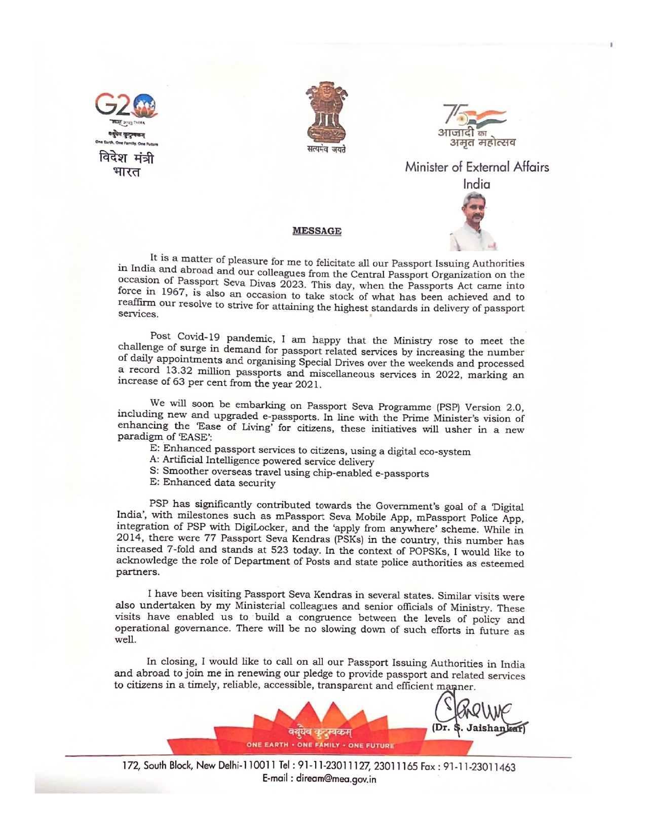 Message of External Affairs Minister on Passport Seva Divas 2023