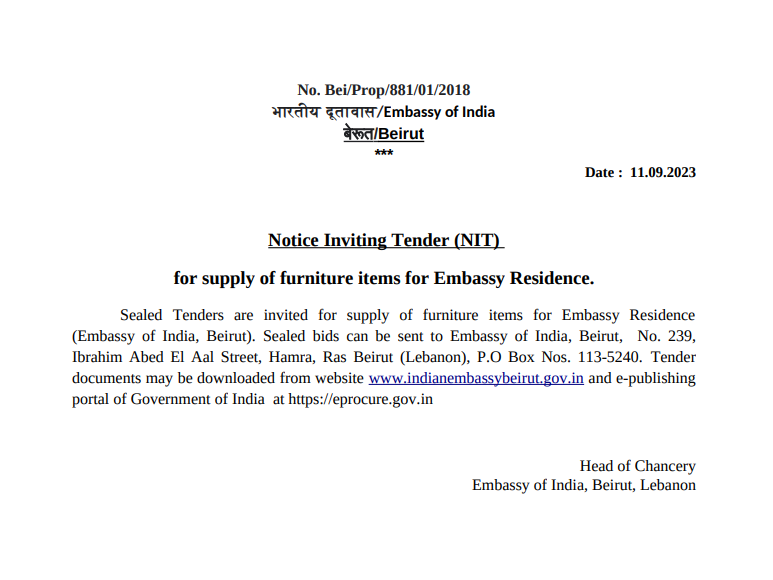 Embassy of India, Beirut invites Tender for supply of furniture items for Embassy Residence. Sealed bids can be sent to Embassy of India, Beirut, No. 239, Ibrahim Abed El Aal Street, Hamra, Ras Beirut (Lebanon), P.O Box Nos. 113-5240. Tender documents may be downloaded from website www.indianembassybeirut.gov.in and e-publishing.