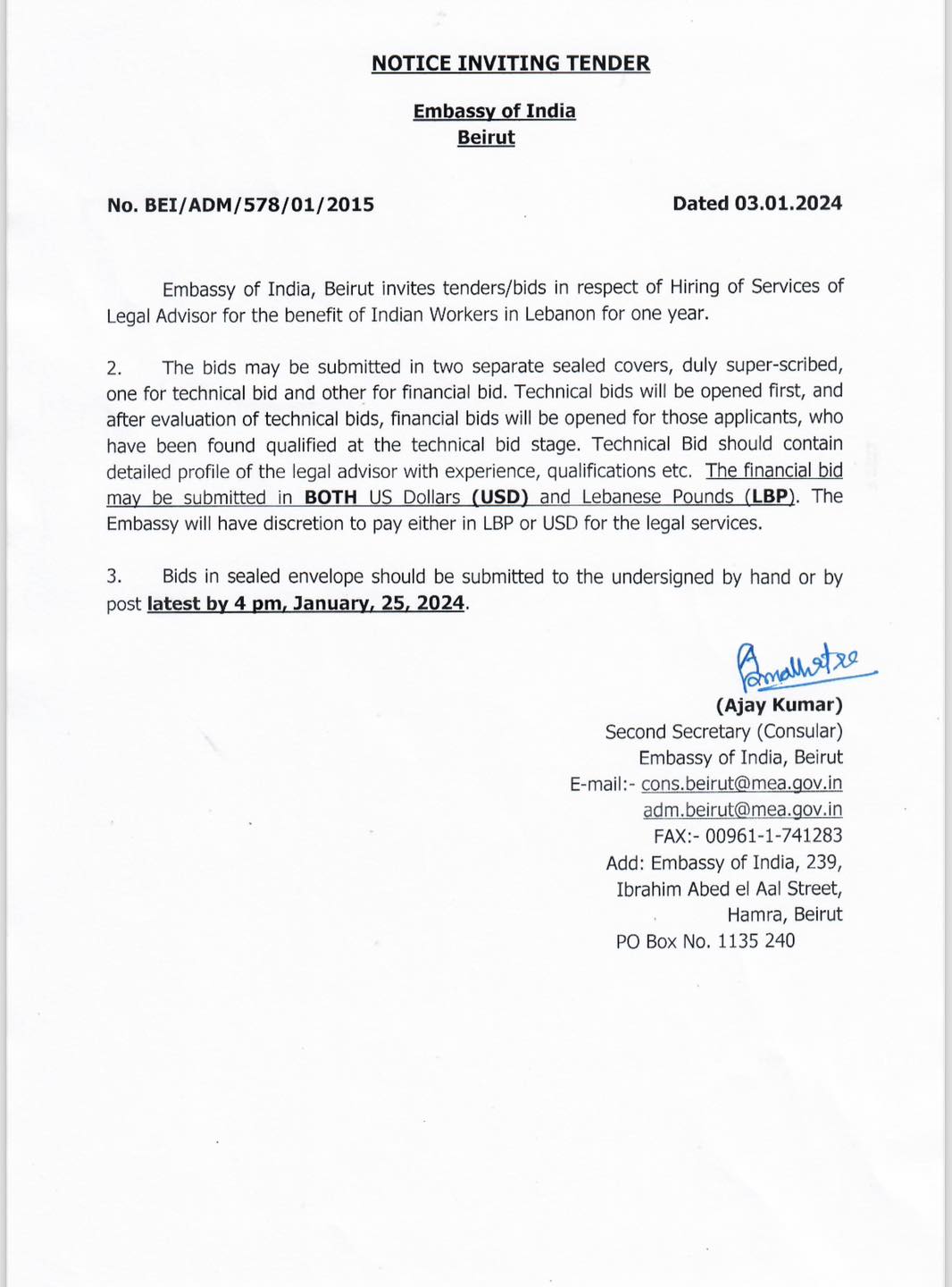 January 05, 2024Embassy of India, Beirut invites tenders/bids for Hiring of Services of Legal Adviser for the benefit of Indian Workers in Lebanon for one year. Bids in sealed envelope may be submitted latest by 4 pm, January 25, 2024.