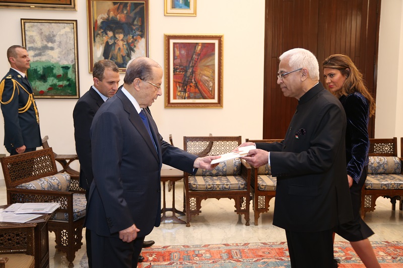 Presentation of Credentials by Ambassador Sanjiv Arora to HE General Michel Aoun, President of the Republic of Lebanon at a most gracious and elegant ceremony at Baabda Palace on 24 February 2017