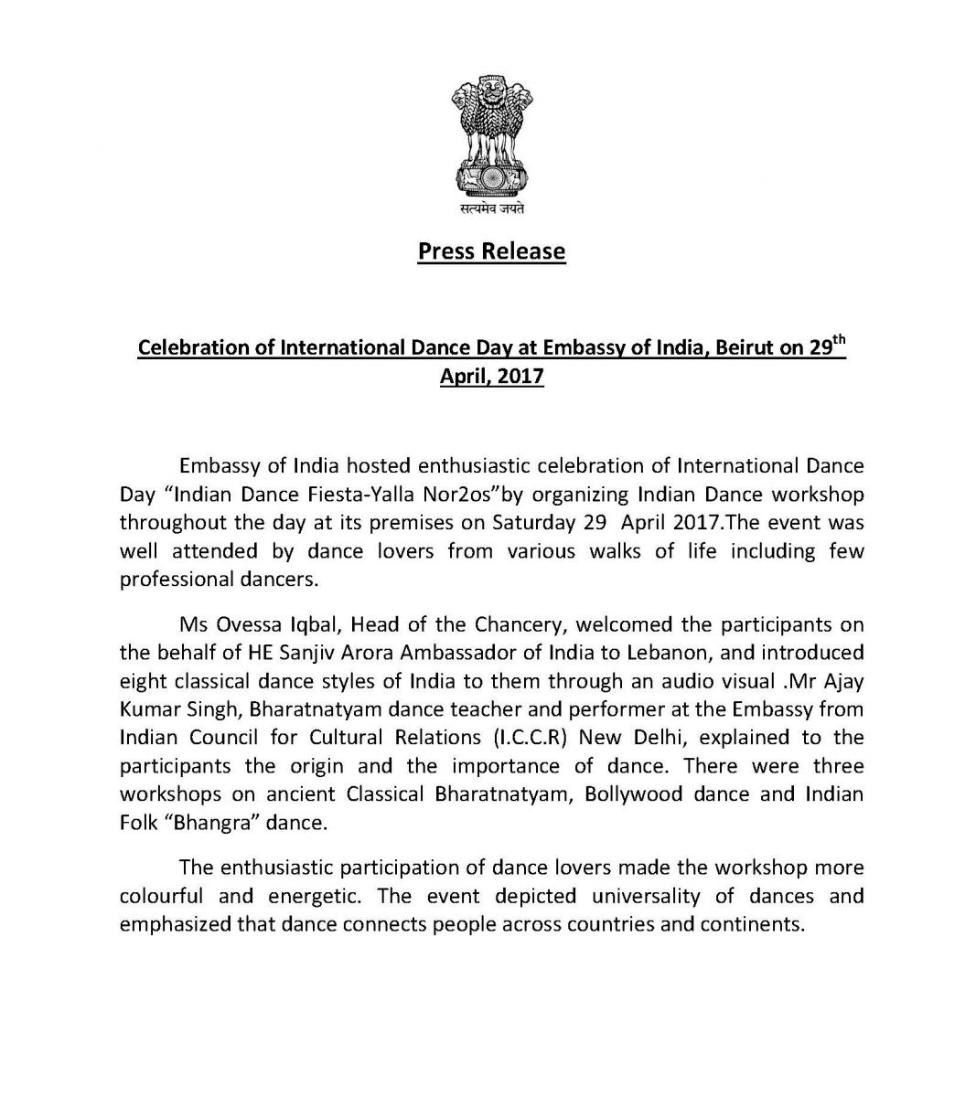 Celebration of International Dance Day at Embassy of India, Beirut on 29th April, 2017